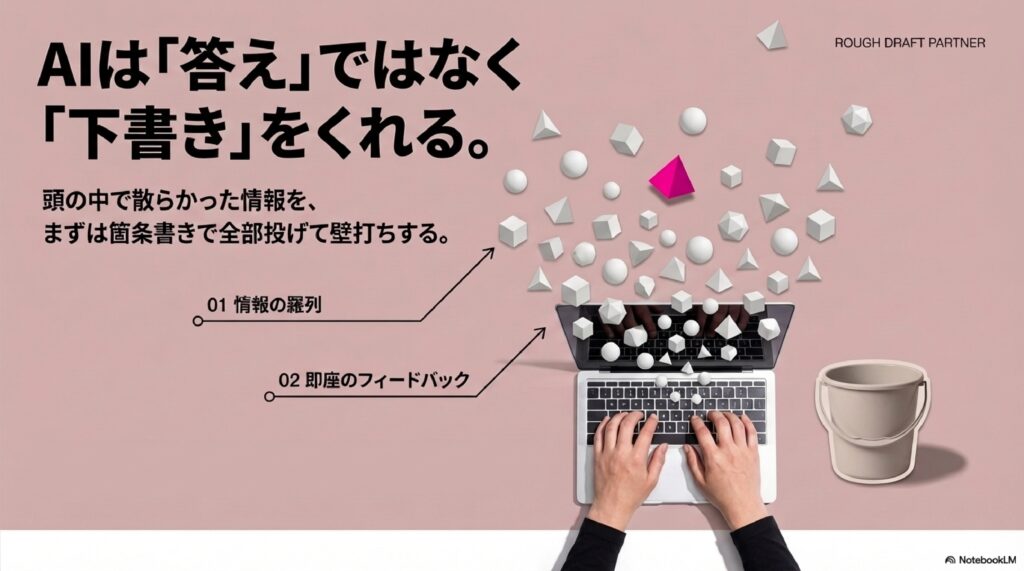 AIは“答え”を出す存在というより、 思考の下書きを作ってくれる存在。ゼロから一人で考えるよりも、 整理された状態からスタートできる感覚があります。